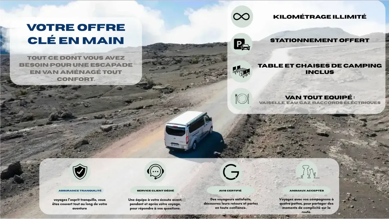 Pour voyager en toute sérénité, nous proposons également des options d’assurance adaptées à la location de vans aménagés, ainsi que des tarifs selon la saison, afin de répondre au mieux à vos besoins.