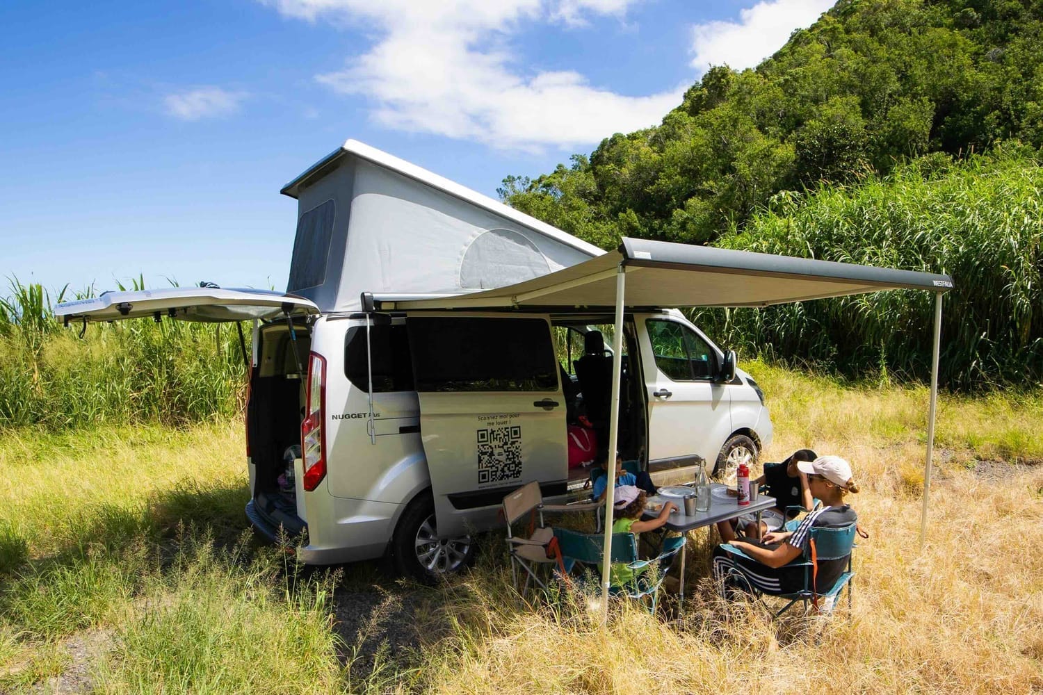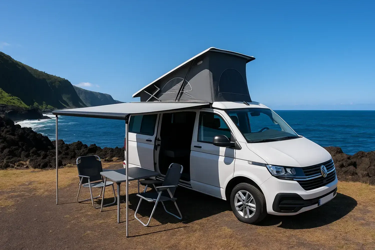 Un van avec équipement très complet et pouvant accueillir 5 personnes avec sa large banquette (et donc son grand lit) à l'arrière et son toit relevable. Table et chaises de camping intégrées.