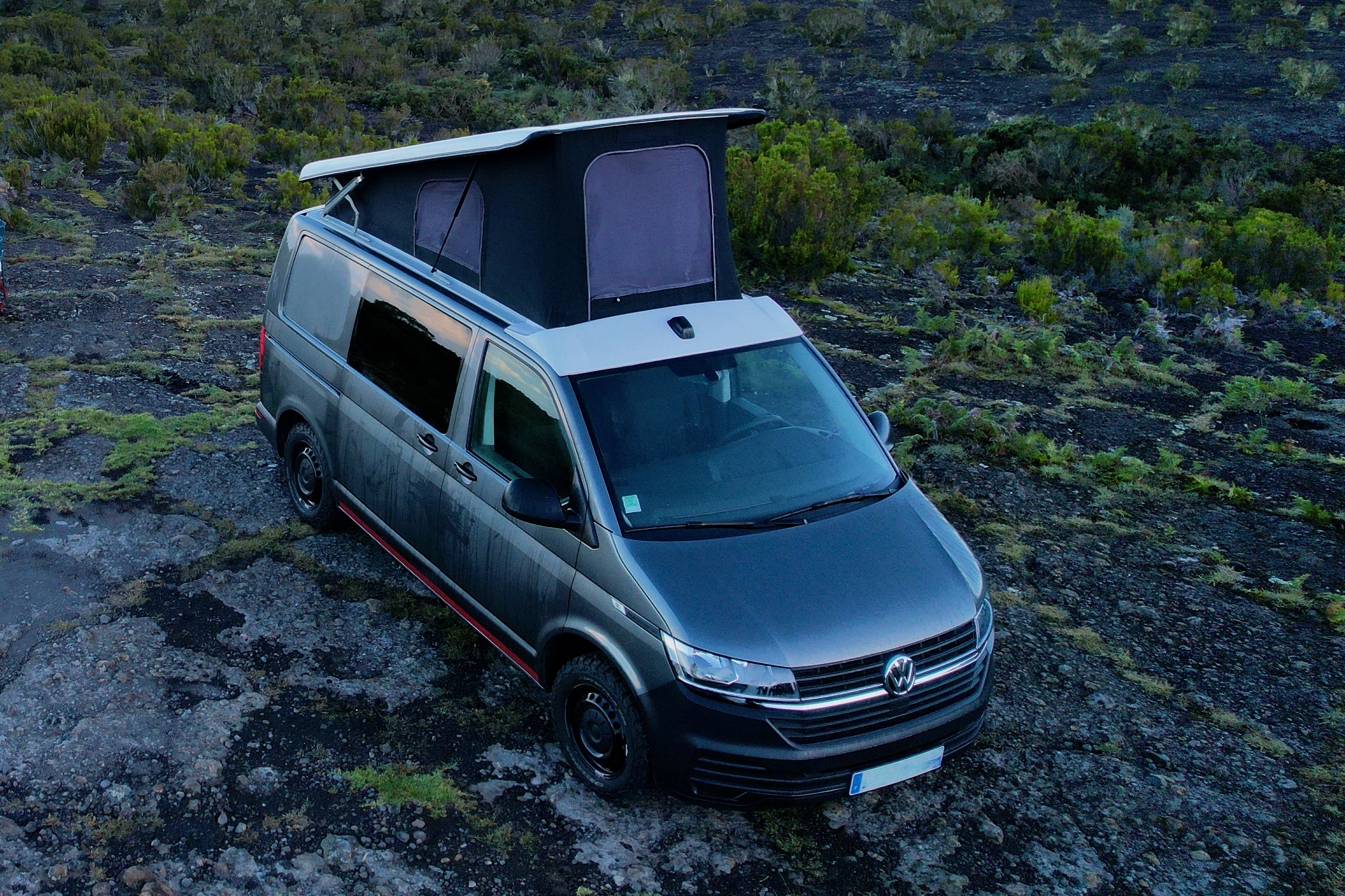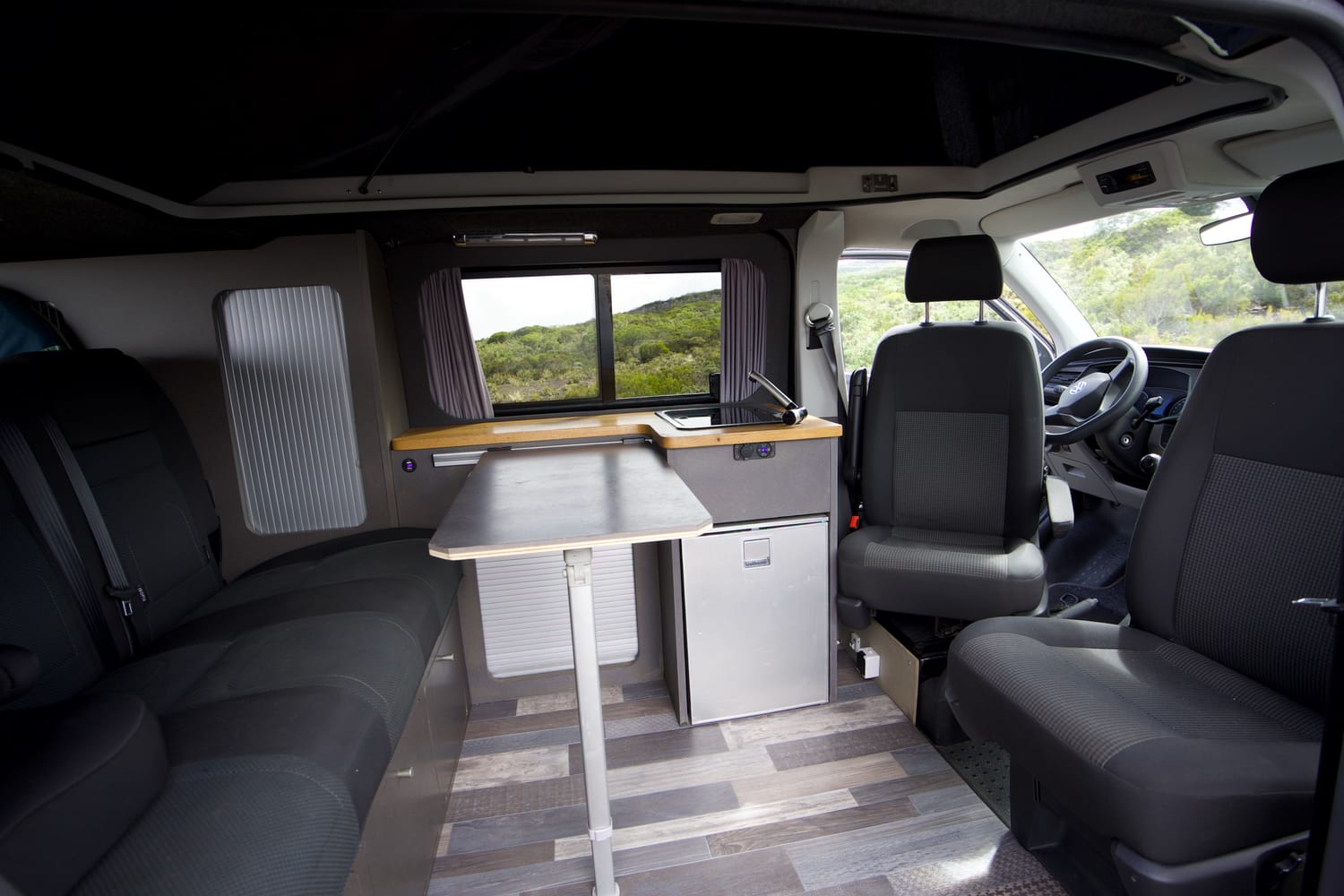 Au moment de passer à table vous pourrez ouvrir le toit pour pouvoir vous tenir debout dans le van, et faire pivoter les 2 sièges avant pour créer un vrai espace salon.